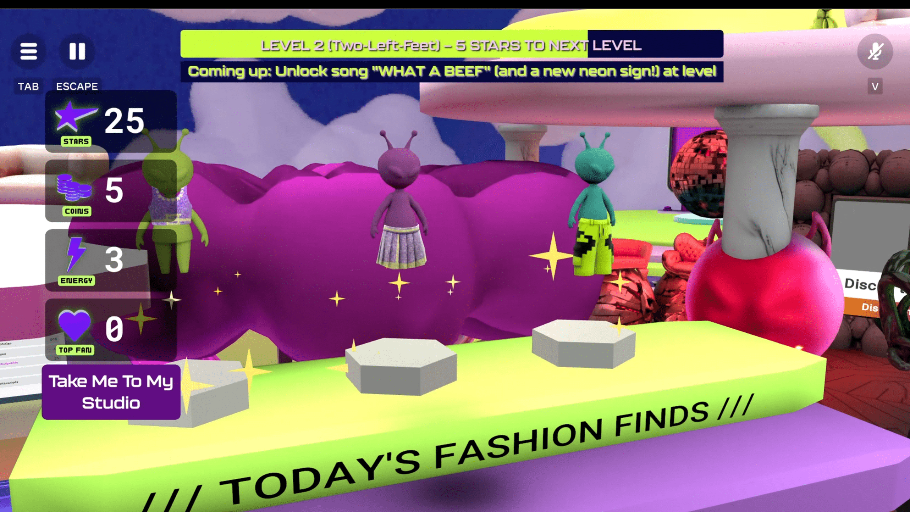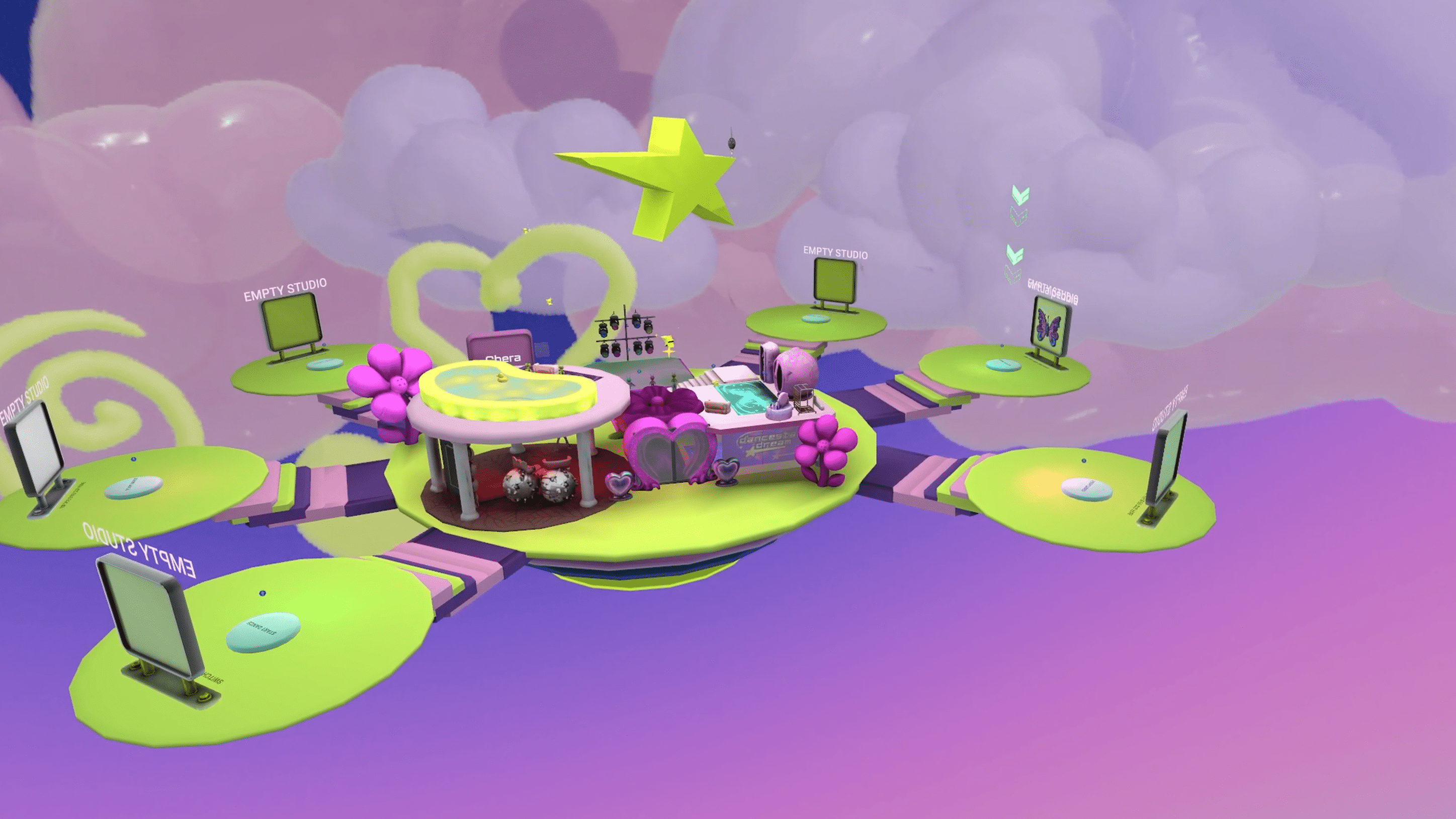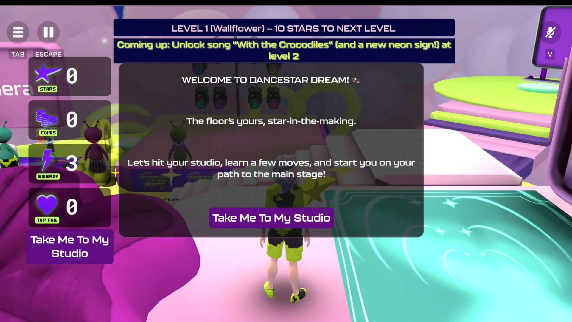 Dancestar Dream is a multiplayer rhythm-dance experience. When players enter, they receive a personal studio to learn swiping and tapping gestures to the beat. As they perform choreography, they earn stars, level up, and unlock outfits and studio decor. Players can also cheer on others with fireworks, interacting from afar.