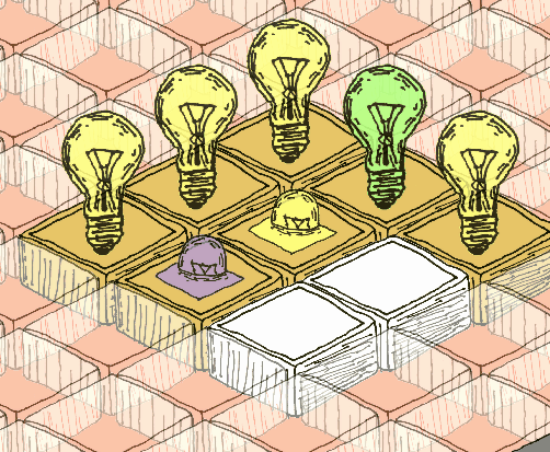 I wanted to try importing hand-drawn art into a game, so a drew some isometric tiles that would work as the grid and lightbulb. I scanned them, cleaned them up, and imported them into Unity to create the game.