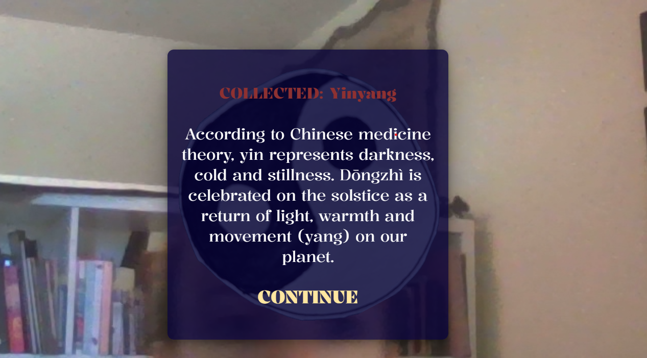 'Light Up the Solstice' is an immersive WebAR experience that integrates hand tracking into a short game where you can learn more about solstice traditions. It was built using AR technologies of 8th Wall (for hand-tracking integration) and A-Frame.